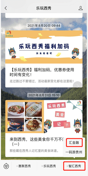 平台主要分为公众号和小程序两个部分,公众号主要负责宣发工作,采用线上结合线下的方式进行宣传推广,运用“互联网+”,推进线上线下更广更深融合,为消费者提供更多便捷舒心的服务和产品。小程序则更多展现应用场景,主要涵盖了四个板块,分别为活动、汇金融、美食和旅游。
